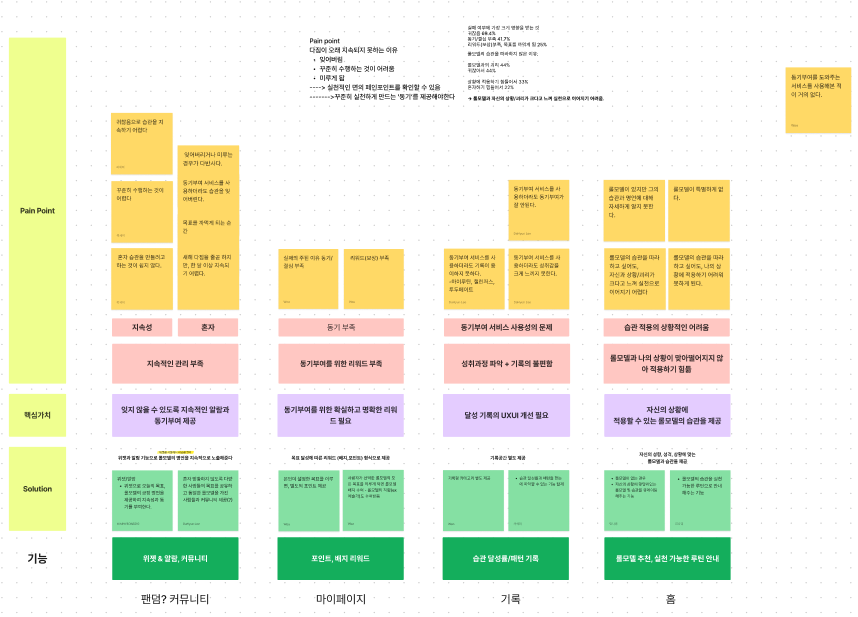 36개의 응답을 기반으로 분석하여 Pain-Point를 작성하고 Solution을 도출하여 메인 기능으로 만들었다.