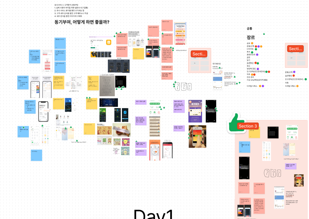 첫날 퍼소나까지라고 되어있던데, 설문이 안나왔는데 퍼소나를 만드는건 뭔가 단계에 안맞는 느낌이라서 둘쨋날로 미루고 설문부터 받기로 했다.
